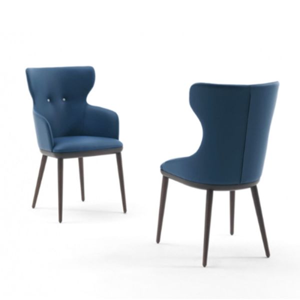 Chair with frame in solid canaletta walnut. Cover is Range fabric (56% cotton, 24% viscose & 20% linen), Eco Pelle synthetic leather (63% Polyurethane & 37% cotton) or Pelle top grain leather.